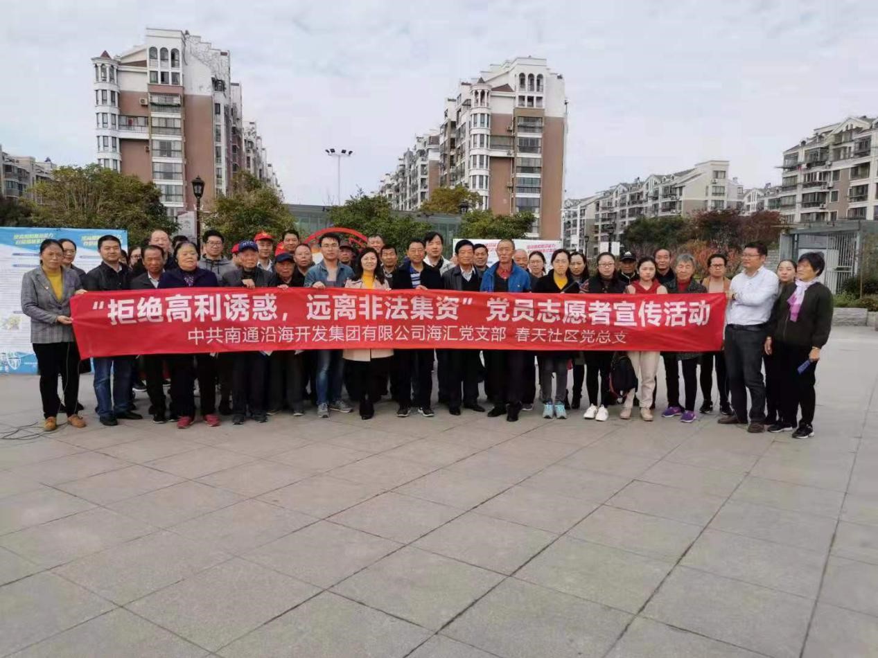 為進一步貫徹落實集團“不忘初心、牢記使命”主題教育工作部署,11月23日上午,海匯黨支部結合本月主題黨日活動,聯(lián)系工作實際,與開發(fā)區(qū)春天社區(qū)黨總支聯(lián)合開展以“拒絕高利誘惑,遠離非法集資”為主題的志愿宣傳活動。