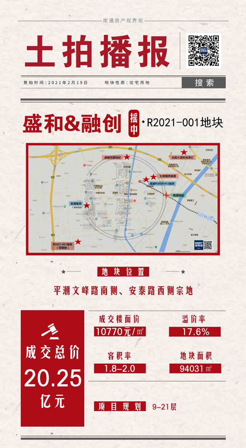 2月19日,平潮高鐵新城“雙限”R2021-001地塊搖號(hào)結(jié)果正式出爐,盛和房產(chǎn)攜手上海融創(chuàng)以總價(jià)20.25億元(成交樓面價(jià)10770元/㎡)摘得R2021-001地塊。