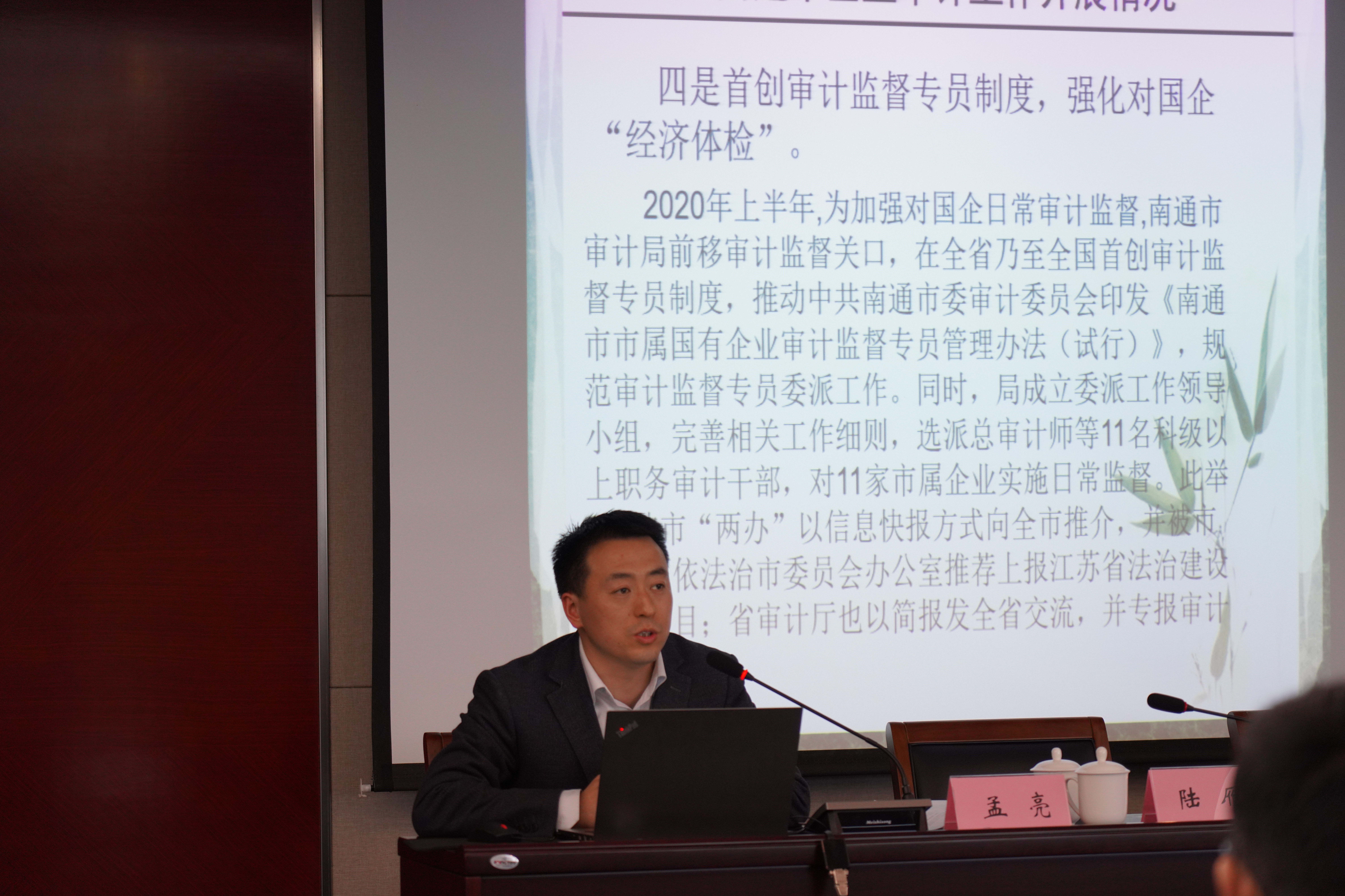 企業(yè)審計處處長孟亮,為大家作《國有企業(yè)審計簡介》講座,他結(jié)合實際案例著重介紹了南通企業(yè)審計開展情況、國有企業(yè)審計的發(fā)展和總體要求、國企領(lǐng)導(dǎo)經(jīng)濟(jì)責(zé)任審計的方法和重點(diǎn)、做好國企領(lǐng)導(dǎo)經(jīng)濟(jì)責(zé)任審計的關(guān)鍵點(diǎn)等方面。