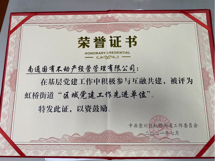 近年來,不動產(chǎn)公司充分發(fā)揚(yáng)黨員同志的先鋒模范作用,積極推進(jìn)黨建工作,受到轄區(qū)街道黨工委和居民朋友們的好評。7月2日下午,虹橋街道“慶祝建黨100周年”主題活動在南通開放大學(xué)中遠(yuǎn)路校區(qū)15樓會議室召開,我司作為街道優(yōu)秀區(qū)域黨建單位受到中共崇川區(qū)虹橋街道工作委員會表彰,被授予“區(qū)域黨建工作先進(jìn)單位”榮譽(yù)稱號。