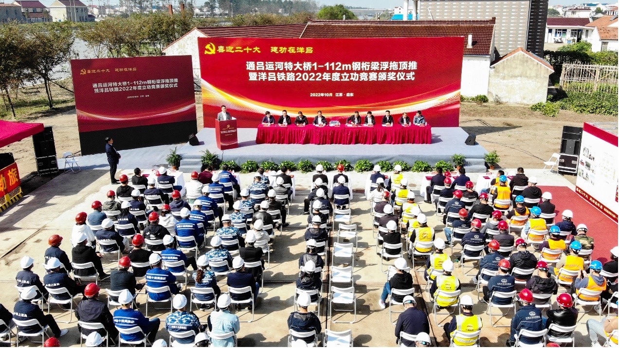 洋呂鐵路舉辦全線首個(gè)112m鋼桁梁浮托頂推暨洋呂鐵路2022年度立功競(jìng)賽頒獎(jiǎng)儀式